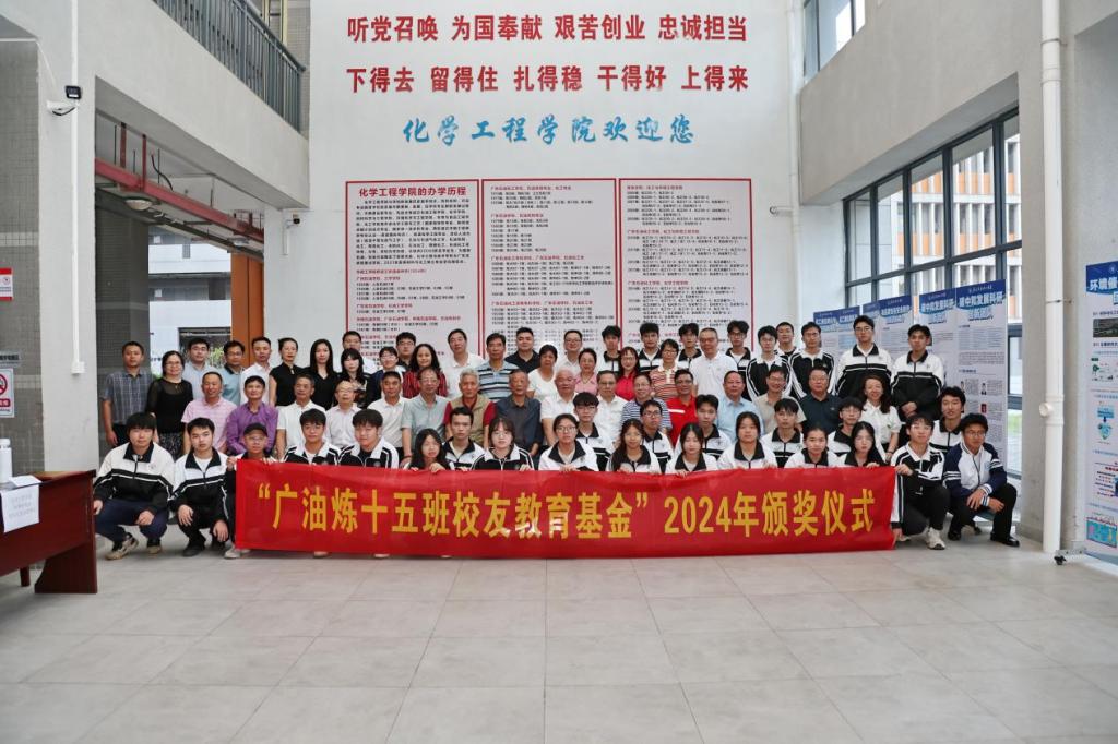 11月10日下午,在437ccm必赢国际版70周年校庆之际,化学工程学院在化工楼C203室隆重举行“广油炼十五校友教育基金”2024年颁奖仪式。学校党委常委、副校长周如金教授、学校党政办公室副主任、校友总会秘书长杨东娥、化学工程学院领导班子成员、广油“炼十五班”20余名校友及获奖师生代表出席了颁奖仪式。