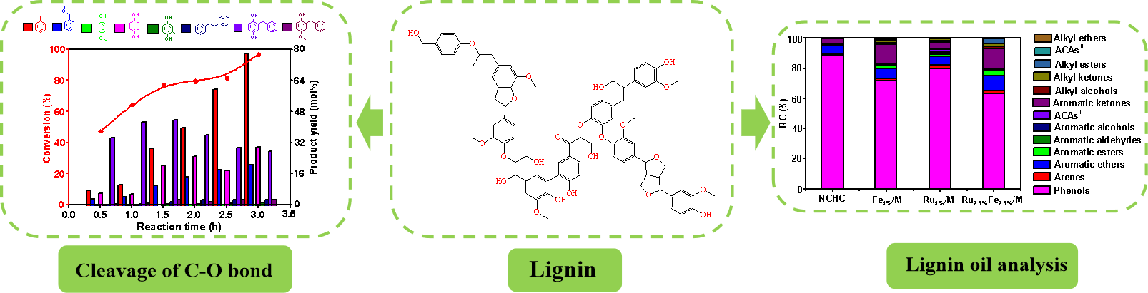 在“碳中和”和“碳达峰”的背景下,从木质素高选择性获取芳香族化合物对木质纤维素生物质的高值化利用至关重要。以调控金属催化剂的金属纳米颗粒的分散性和尺寸为导向,利用FeOx改性Ru/M制备RuFe纳米催化剂用于木质素氢解富产芳香族化合物研究。研究发现FeOx能有效提高RuFe纳米颗粒的高分散性和减少其尺寸,通过动态实验手段监测β-O-4和α-O-4特征化学键活化和精准断裂的过程,结合多种表征和催化活性测试证实RuFe纳米颗粒与酸性位的协同催化有利于提高反应性能。在此研究工作中,通过木质素氢解过程的优化,能够获取47.8 wt%木质素油并且酚类化合物的含量最低。并利用GC/MS、FTIR和2D HSQC NMR对木质素油分子组成结构进行综合分析。此研究工作为木质素温和热转化制取芳香族化合物提供理论指导。