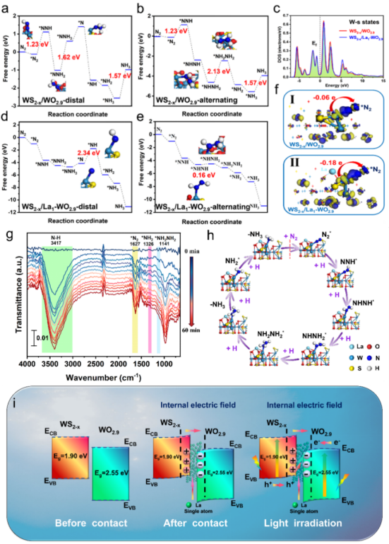 图2. WS2-x/WO2.9与WS2-x/La1-WO2.9在光催化氮固定(PNF)过程中的反应机理解析