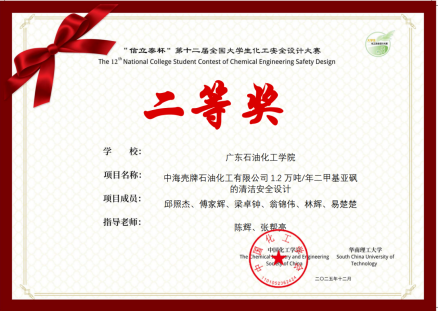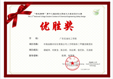近日,“信立泰杯”第十二届全国大学生化工安全设计大赛落下帷幕,经过7月的艰苦努力和奋力拼搏,由陈辉教授、张帮亮和黄燕青老师指导的支队获奖两个团队成员分别由化学工程学院、能源动力学院学生组成,他们是⻘硫素氧团队(成员:邱照杰、傅家辉、梁卓钟、翁锦伟、林辉、易楚楚)获等奖,安全合砜团队(胡城玮、刘家宝、陈志轩、刘永辉、张艺钒、王成崧)获优胜奖。