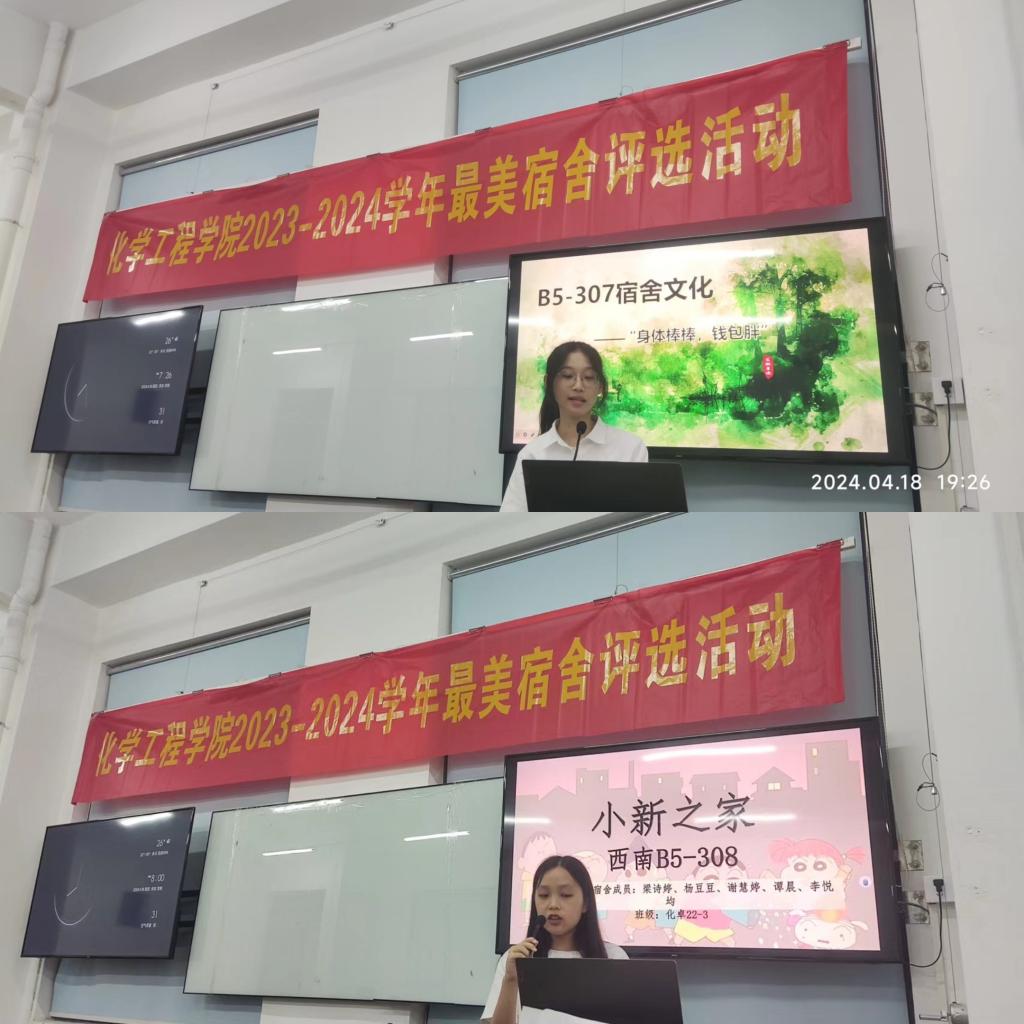 4月18日晚,化学工程学院“最美宿舍”评选决赛在化工楼C104举行。在决赛现场,8个参赛宿舍按照抽签顺序依次上台演讲和才艺展示。他们富有感情的演讲,向评委和观众介绍了自己宿舍的独特之处和温馨氛围。他们讲述了宿舍成员之间的趣事和共同经历,分享了宿舍文化的点滴积累,有的充满了浓厚的学习氛围,有的洋溢着欢乐的生活气息,有的则蕴含着温馨娴静的文化元素,充分展示了大学生朝气蓬勃的精神面貌和青春激昂的精神状态。除了精彩的演讲,各宿舍团队还准备了丰富多彩的才艺展示。有的宿舍带来了精心准备的大合唱,有的宿舍则献上了感情丰富的歌曲独唱,这些精彩的才艺展示不仅体现了同学们的个性魅力,也进一步加深了彼此之间的友谊和默契。
