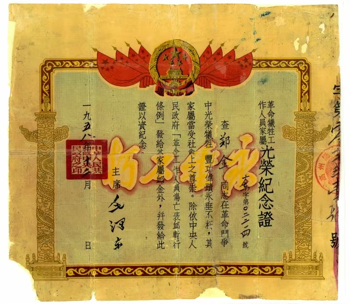郑坤慧,1975年7月生,茂名市茂南区鳌头籍革命烈士郑金的孙女,致力红色文化宣传,她本人虽未能与实践团当面相见,但却通过线上访谈的方式,用一份特殊的“礼物”(一张由毛主席颁发的烈士证),让先烈精神跨越了时空呈现在实践团成员面前,纸张虽已泛黄,但“郑金同志为革命牺牲,丰功伟绩永垂不朽”的字迹仍力透纸背。
