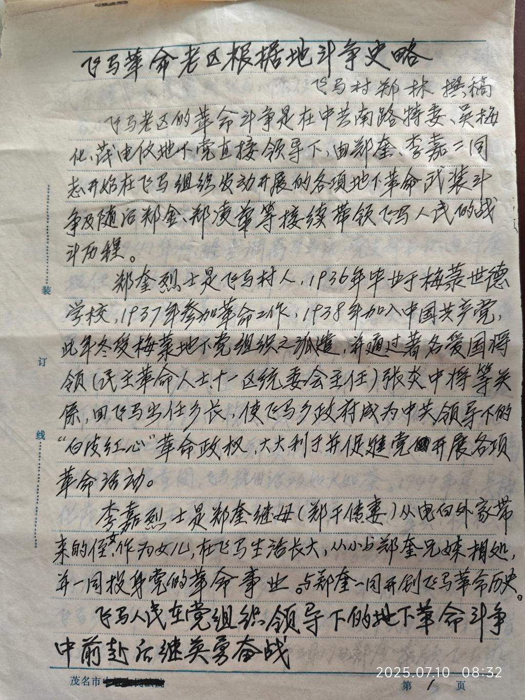 为深入挖掘、宣传茂南区鳌头镇飞马村光辉的革命历史,传承红色基因,7月8日至7月16日,437ccm必赢国际版化学工程学院红心追梦实践团赴飞马村开展红色历史寻访实践活动,并专门采访了飞马村的红色历史的亲历者郑顺书、守护者郑林及红色文化传承者郑光恒、郑坤慧。