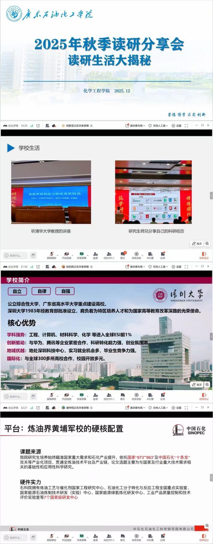 广东工业大学的明紫莹同学分享了化学工程专业绿色能源催化方向的读研体验,她提到读研生活相对自由,在学术能力、时间管理和心态调整上收获颇丰,建议同学们尽早确定目标、制定计划。深圳大学的张凯程同学介绍了固态电池方向的科研日常,提及深大科研实力强劲、校企合作丰富,提醒同学们正视科研压力、学会调节情绪。中国石油化工股份有限公司石油化工科学研究院的唐梓翔同学则详细介绍了研究所的优势,包括顶级导师资源、丰厚助学金及高就业率,重点说明报考机会较大,鼓励同学们多多尝试。