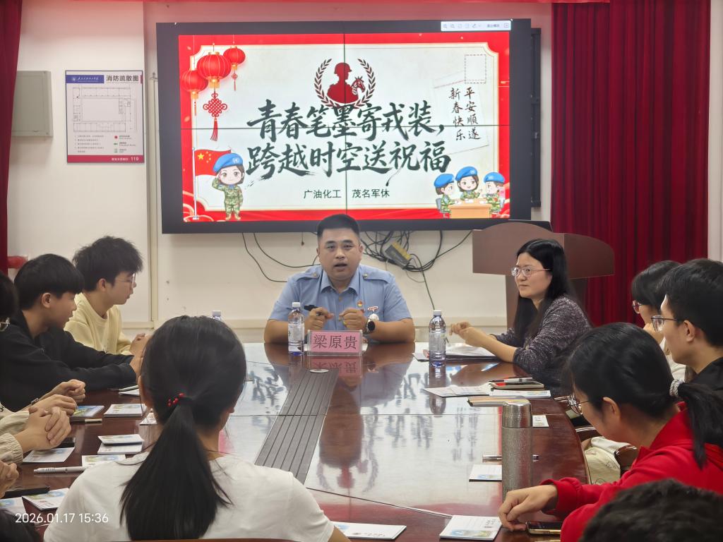为深入推进国防教育,弘扬爱国拥军优良传统,1月17日下午,化学工程学院在化工楼C204举办“青春笔墨寄戎装,跨越时空送祝福”主题活动,组织师生为远在亚丁湾执行任务的人民子弟兵书写新春贺卡,传递真挚祝福。学院辅导员黄丹颖、学生代表以及茂名市军队离休退休干部休养所军休干部梁原贵共同参加了本次活动。