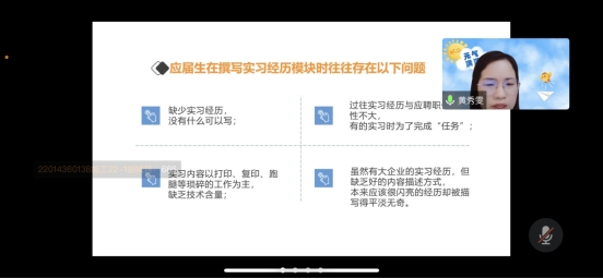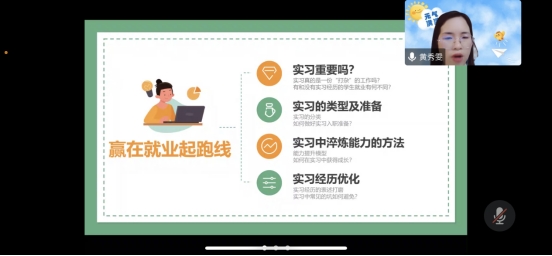 为做好我校2023届毕业生就业指导工作,精心策划好我校毕业生就业指导活动,3月12日晚黄秀雯老师在腾讯会议与同学们分享《如何获取实习最大价值》话题,各年级感兴趣的同学参加了分享。